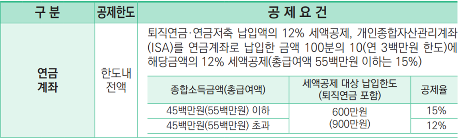 • 설명: 노후 대비를 위해 연금 계좌에 납입한 금액에 대해 세액공제