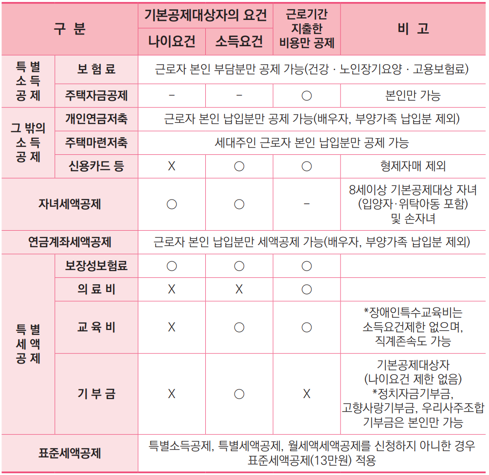 - 부양가족: 1인당 150만 원 (소득 100만 원 이하, 나이 요건 충족 시).