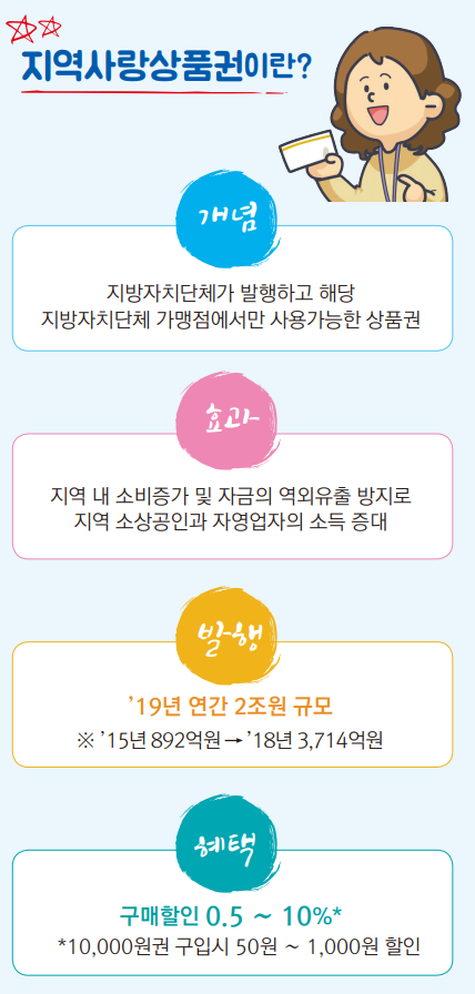 각 지역지자체 내 가맹점에서 사용할 수 있으며, 일정 금액을 할인된 가격으로 구매할 수 있습니다.