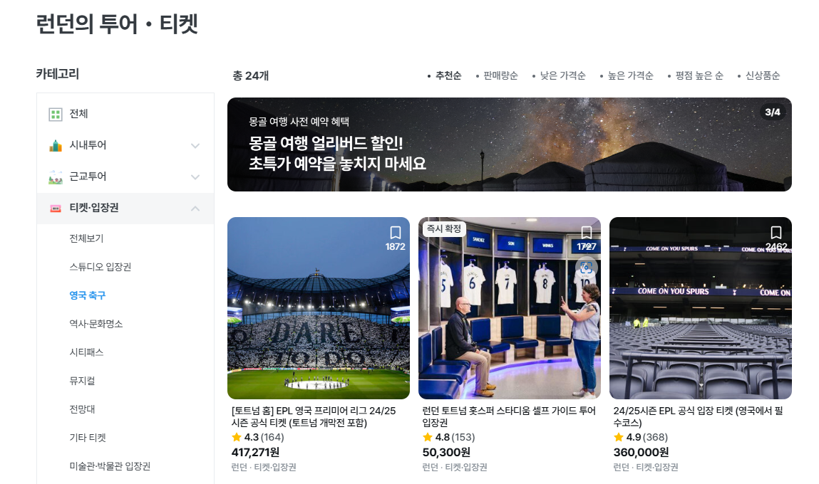런던 영국 축구 - [추가 할인 티켓・토트넘 홈] EPL 영국 프리미어 리그 24/25 시즌 공식 티켓